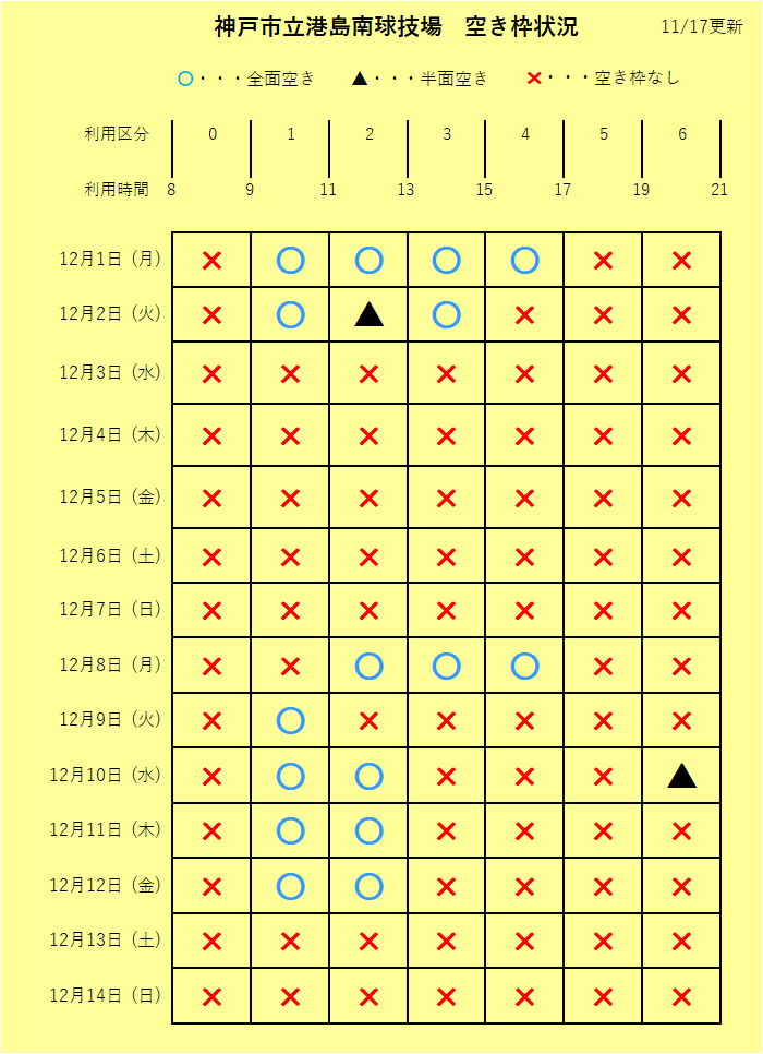 12月1日 (月) ~ 12月14日 (日) のグラウンド空き状況のご案内です。