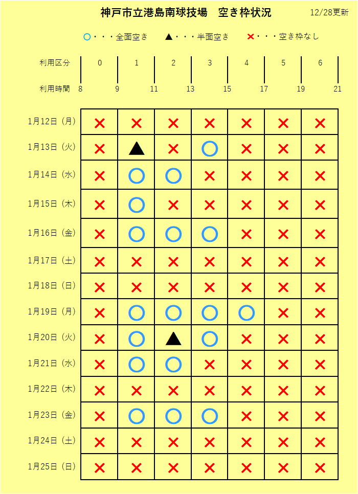 1月12日 (月) ~ 1月25日 (日) のグラウンド空き状況のご案内です。