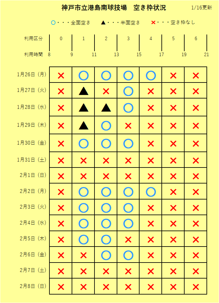 1月26日~2月8日 グラウンド空き状況のご案内 投稿日: 2026-01-162026-01-16 投稿者: 港島南球技場 いつも神戸市立港島南球技場をご利用いただき、誠にありがとうございます。 1月26日 (月) ~ 2月8日 (日) のグラウンド空き状況のご案内です。 直近の予約やキャンセルの状況は、上記に反映されておりませんので 『神戸市_あじさいネット 』 ➝ 『施設空き照会』にてご確認をお願いいたします。 ご不明な点がございましたらご連絡ください。(神戸市立港島南球技場 TEL:078-306-5515) この機会にぜひご予約下さい。